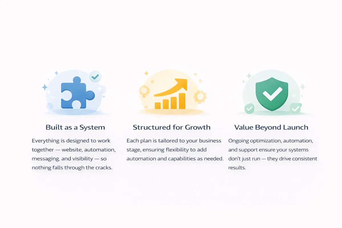 Our pricing is structured to solve that problem. Each plan is designed around what businesses actually need at different stages of growth, not arbitrary features. As your business grows, your system grows with you — adding automation, optimization, and scalability only when it makes sense.