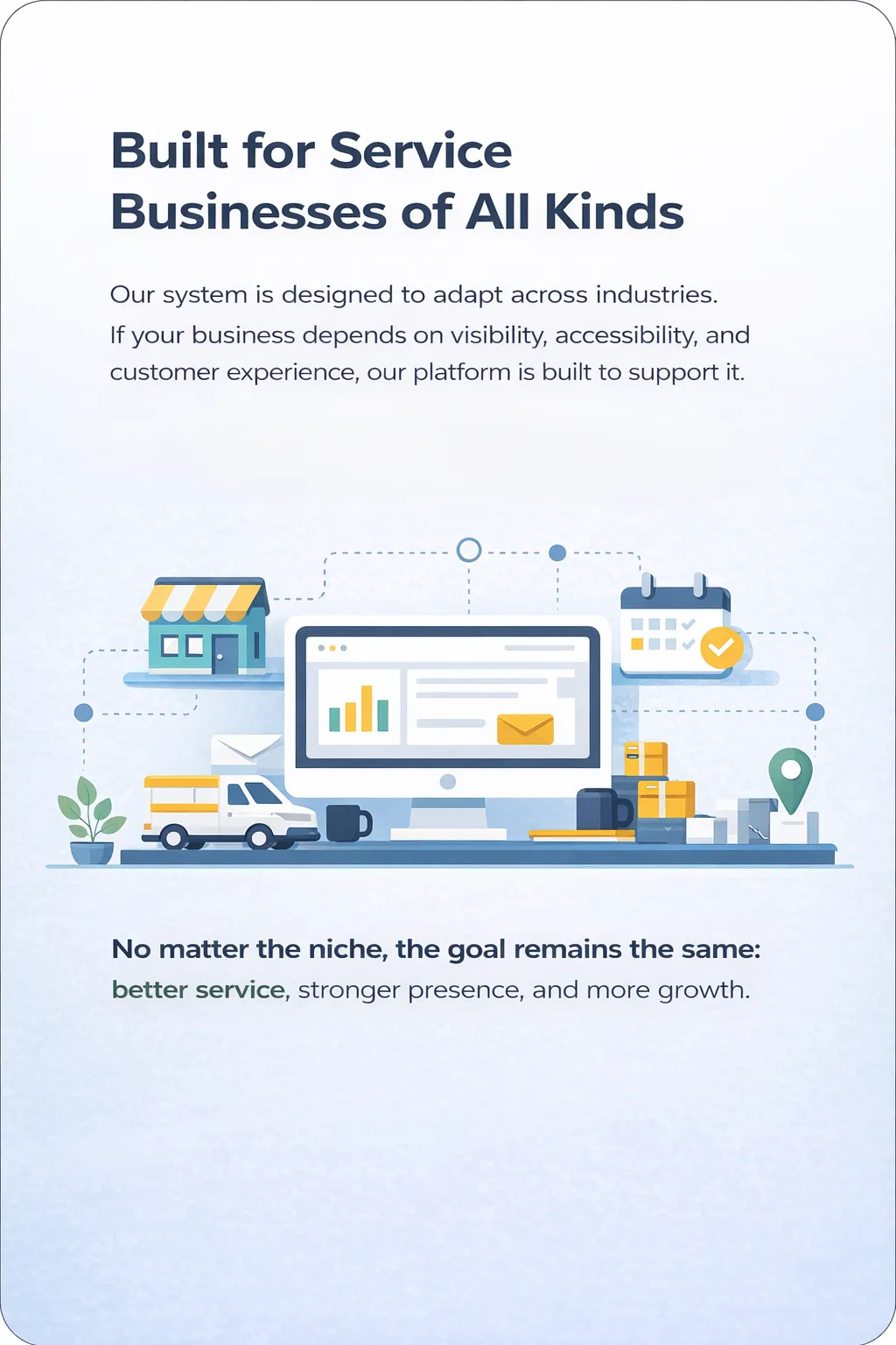 Absolutely. The industries shown are examples, not limitations. If your business depends on leads, bookings, customer communication, or local visibility, our system can be customized to support your specific niche